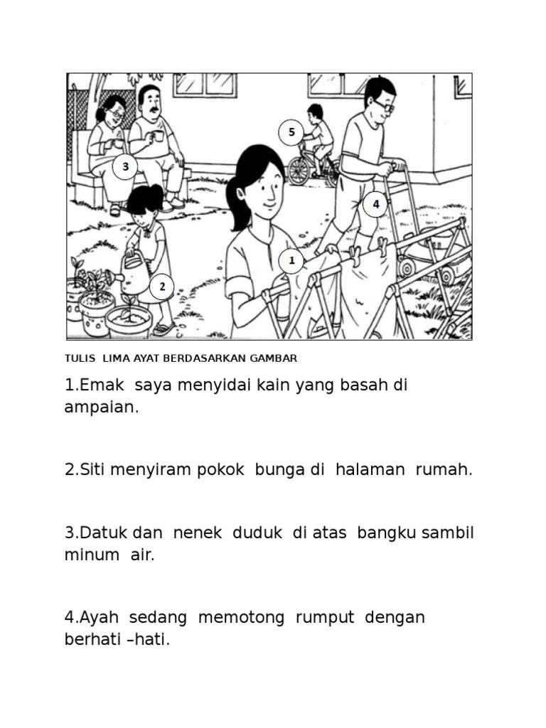 Tulis lima ayat yang lengkap berpandukan gambar di bawah . 7/23/2019 tulis lima ayat berdasarkan gambar 1/2tulis lima ayat berdasarkan gambar1.emak saya menyidai kain yang basah diampaian.2.siti menyiram pokok bunga .